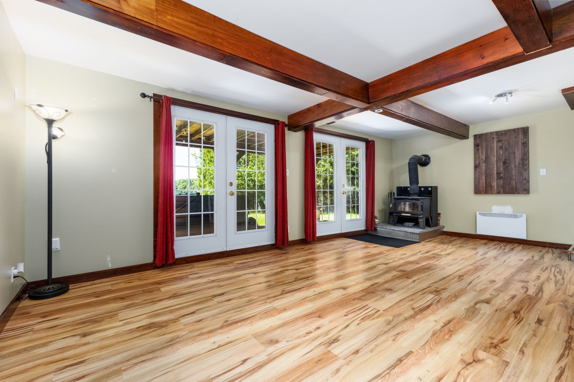 - Spacious living room with a wood-burning stove and direct access to the outdoors
